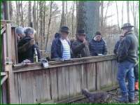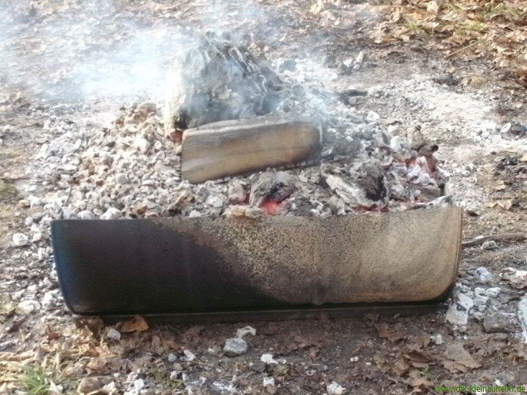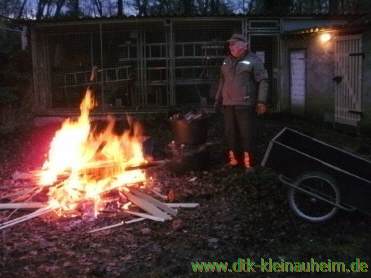 Nach tagelangen Regenfällen hatte Petrus ein Einsehen und schickte uns trockenes Wetter. Um 07:00 Uhr entfachte Richard Krellmann das Feuer aus den Holzscheiten, die von diversen Fällaktionen auf dem Gelände lagern. Etwas später kamen noch Siegmar Angerer und Wolfgang Cocek zu Hilfe. Klaus Weyland hatte eine neue Wanne für die Glut mitgebracht, in der nachher das Fleisch gegart werden konnte. Das half, den Holzeinsatz zu reduzieren.