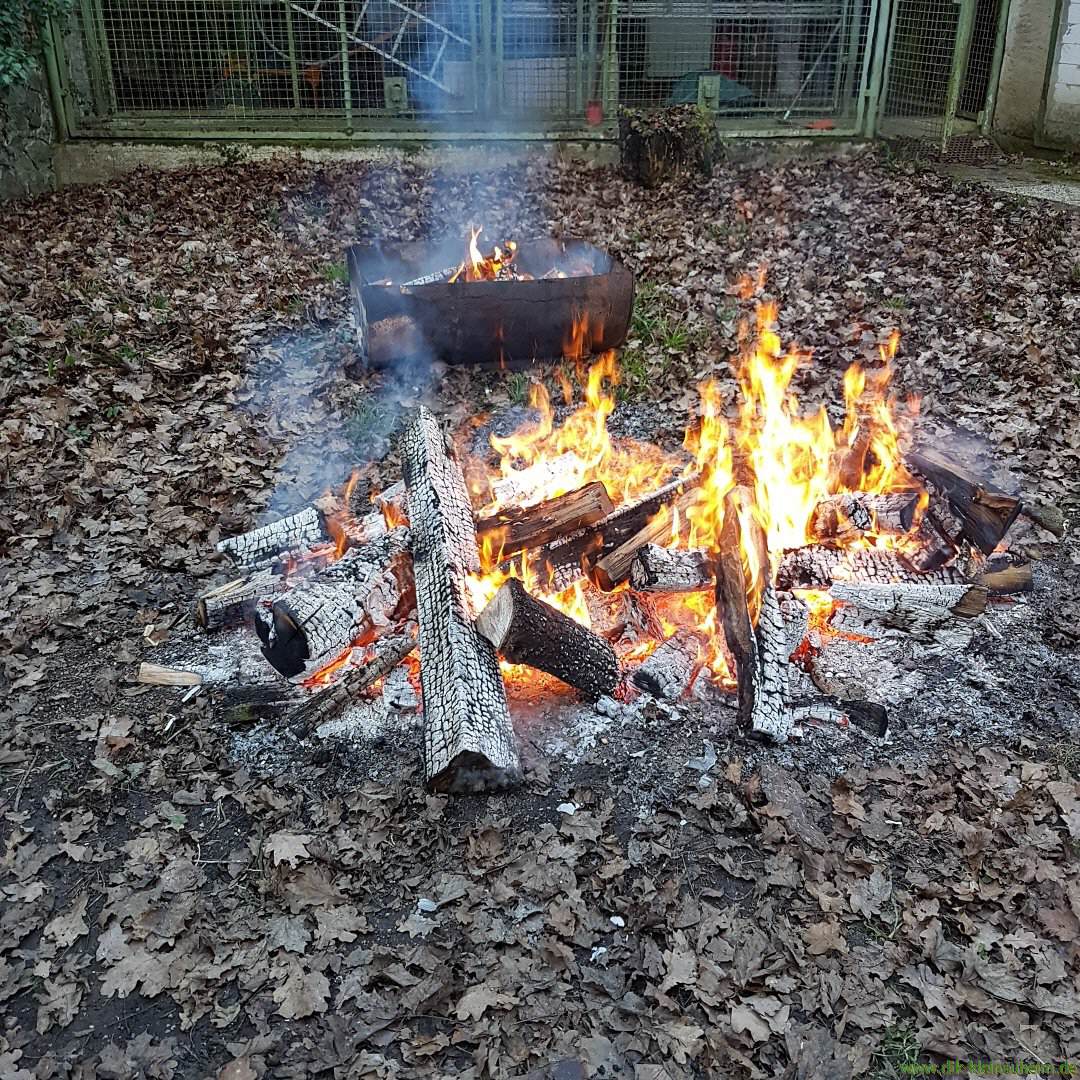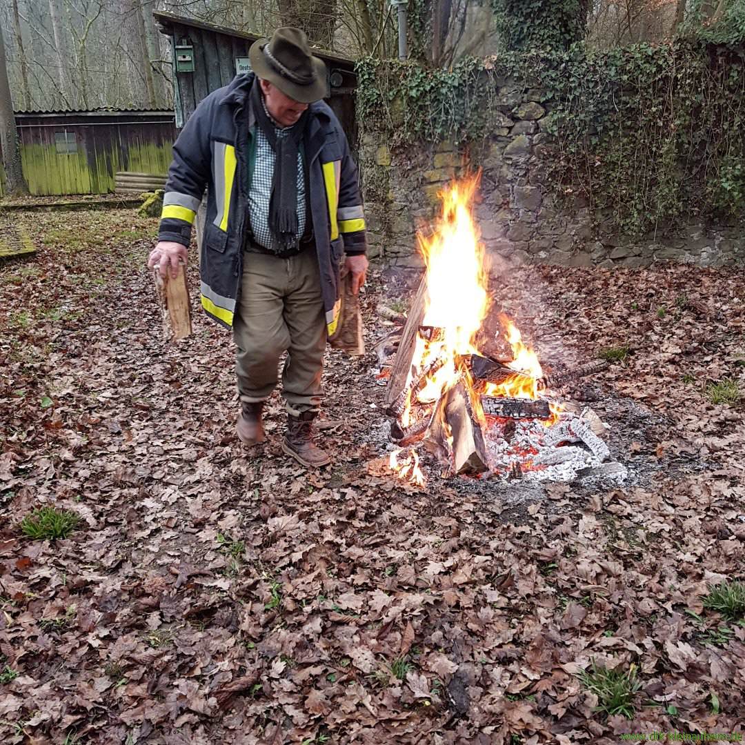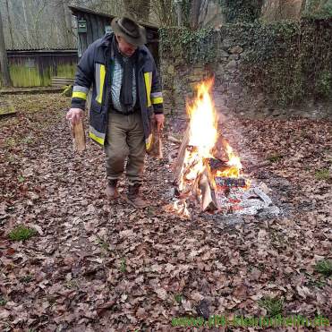 Richard Krellmann entfachte bereits zu früher Tageszeit das Feuer aus den Holzscheiten, die auf dem Gelände lagern. Die von Klaus Weyland bereitgestellte Wanne half, den Holzeinsatz zu reduzieren. Etwas später kamen noch Klaus Weyland und Siegmar Angerer zu Hilfe.