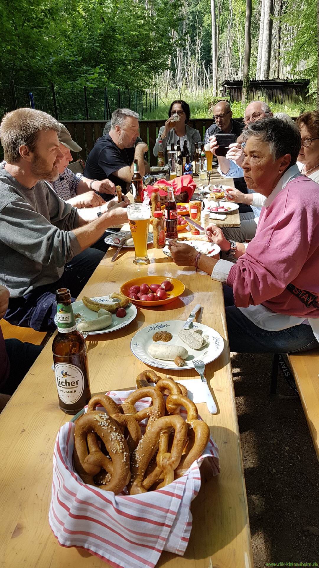 Gerda hatte frische Brezeln gebacken und auch Radieschen wurden vorbereitet. Die Würste badeten ab 10:30 Uhr in warmem Wasser und warteten darauf, von den anwesenden Mitgliedern und Gästen zusammen mit süßem Senf, den Brezeln und den scharfen Beilagen verspeist zu werden. Bald war der gesamte Bestand vertilgt,