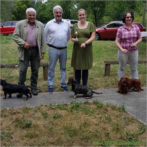 Wir hatten wieder alle Haararten und auch die Größen Standard und Zwerg dabei. Nach den einzelnen Bewertungen wurde der schönste Hund jeder Haarart bestimmt. Die drei schönsten ihrer Haarart traten danach zur Wahl des schönsten Teckel der Ausstellung an.