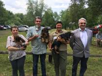 Als das Aufbauteam am Sonntagmorgen um 9.00 Uhr auf unserem Übungsplatz eintraf, um für die Zuchtschau alles vorzubereiten, herrschte Weltuntergangsstimmung. Es regnete in Strömen und alle, die nicht zufällig eine Regenjacke im Auto hatten, waren im Nu bis auf die Knochen nass. Die Stimmung war schnell auf dem Nullpunkt, wie sollte bei einem solchen Wetter eine Zuchtschau stattfinden! Aber Petrus hatte ein Einsehen und der Regen machte einem strahlenden Sonnenschein Platz. |