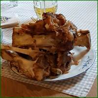 19 Haxen waren nach vorheriger Anmeldung bei Gerda Cocek von Klaus Weyland bei einen Caterer bestellt und knusprig zubereitet worden. Sein Sohn brachte sie pünktlich zum Mittagessen in die Hütte.
