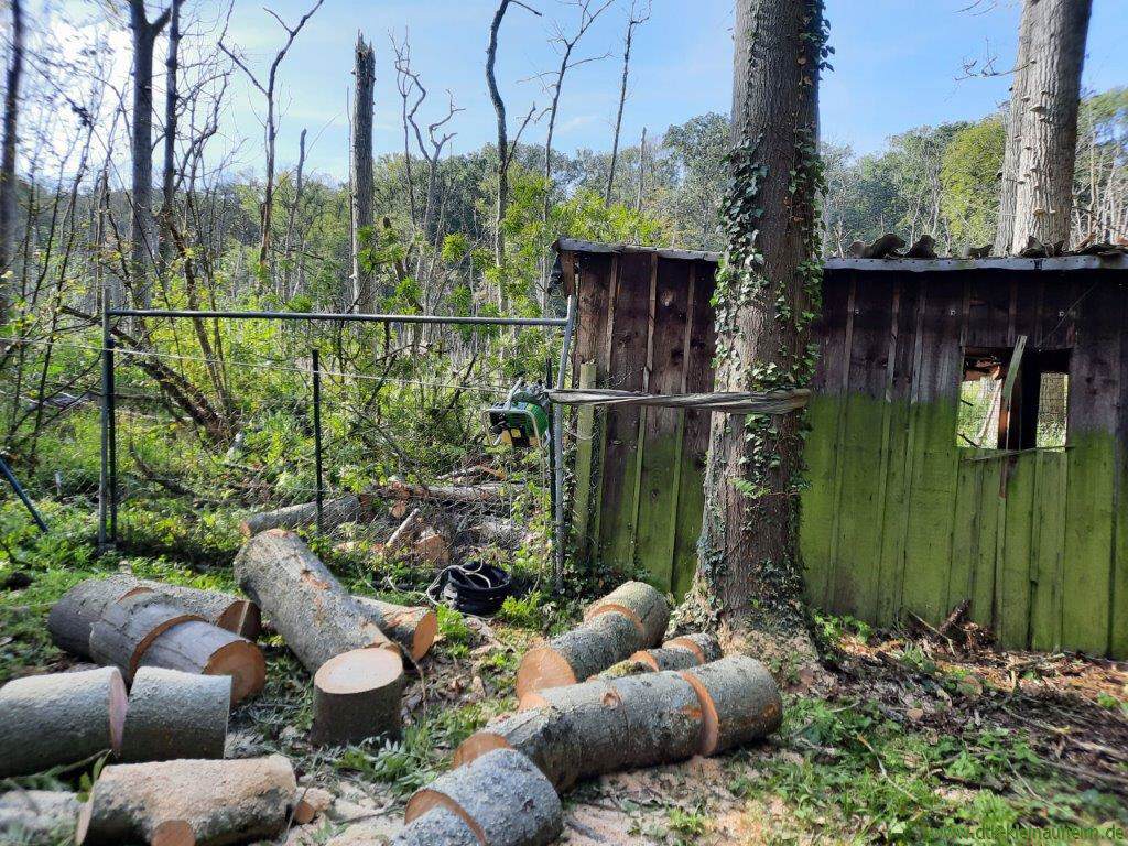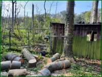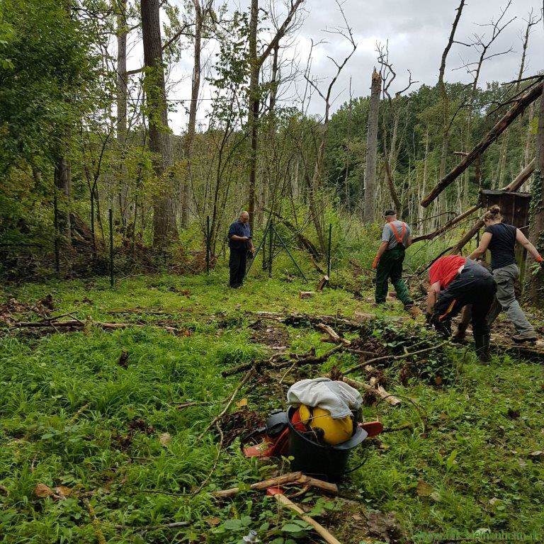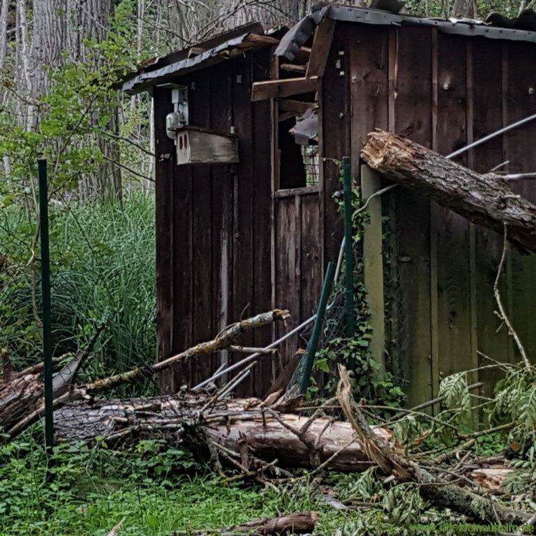 Große Äste waren auf das sogenannte Bienenhaus gefallen und hatten es schwer beschädigt. Auch der angrenzende Zaun war demoliert, sodass wir keine Hunde dort mehr frei laufen lassen konnten.