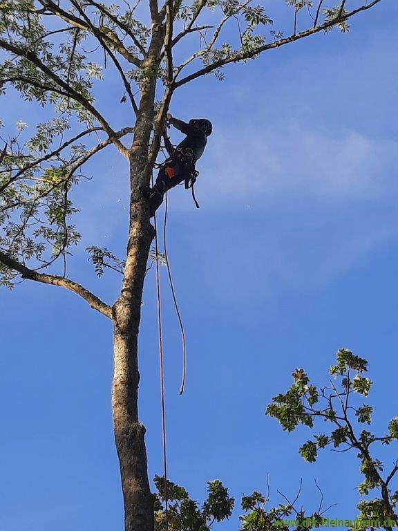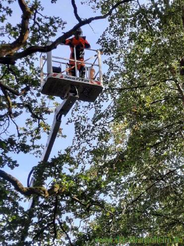 Die noch stehenden Bäume machten uns weiterhin Sorgen. Da Hessen Forst aus Gründen der Verkehrssicherung einige Bäume auf dem Zugang zur Hütte beschneiden wollte, setzte sich Otto Grünewald mit ihnen in Verbindung. Es gelang ihm, die beauftragte Firma auch zum Arbeiten an den hinter unserem Gelände stehenden Bäume zu engagieren. So wurden am 15.9. mit professioneller Hilfe auch hier Pflegearbeiten durchgeführt.