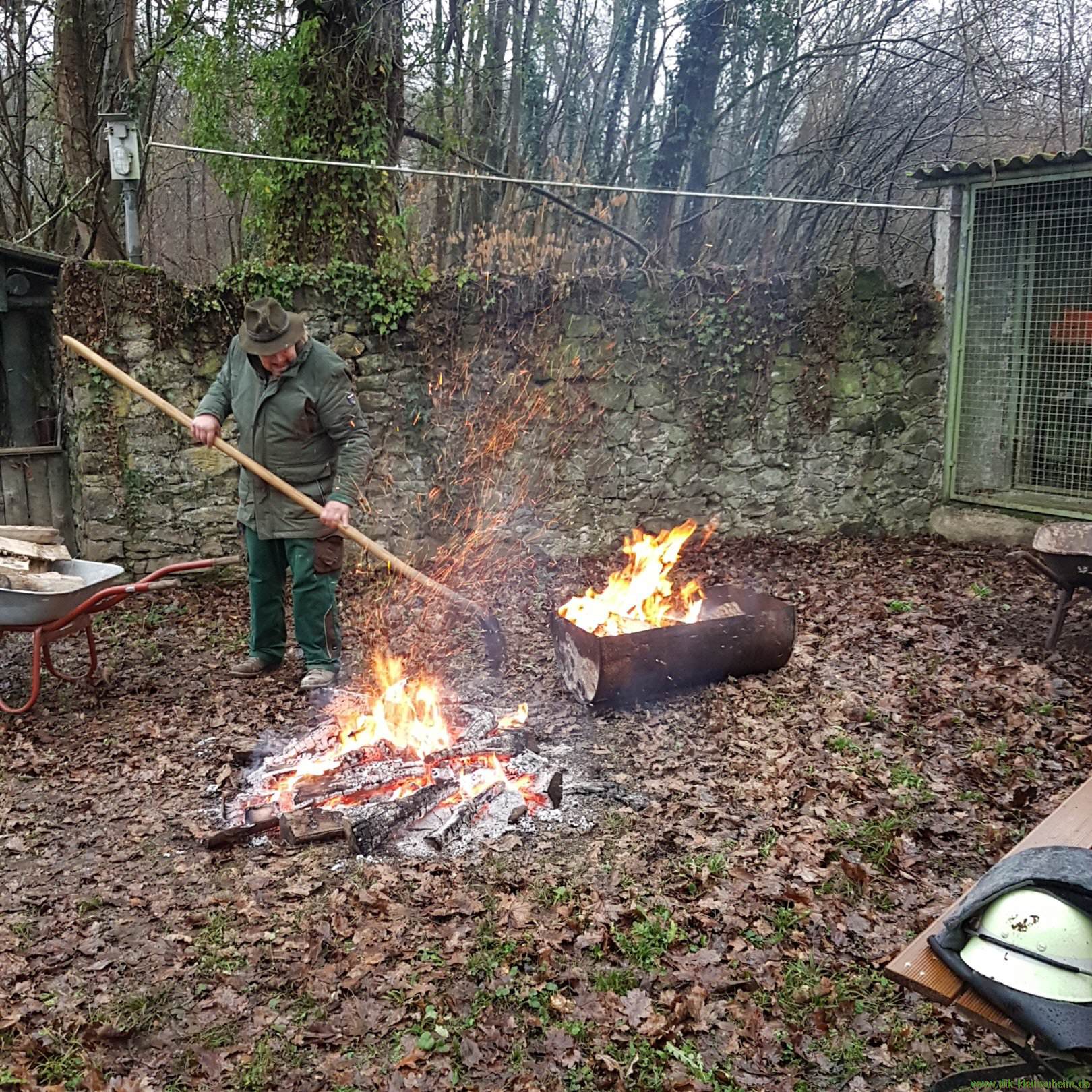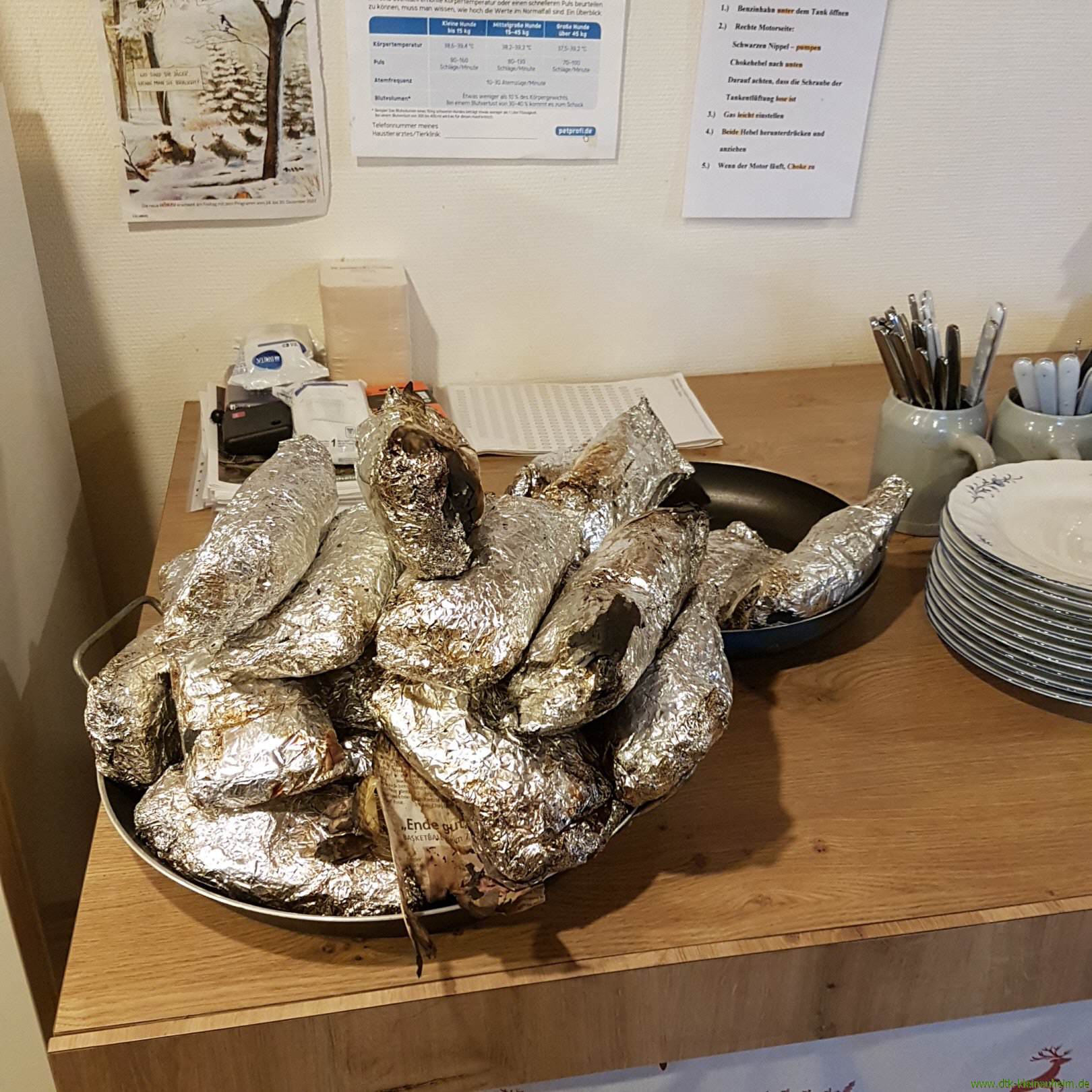 Die von unserem Vereinsmetzger Dieter Pfarr zubereiteten Fleischpäckchen wurden in der Glut gegart, nachdem sie von Siegmar sicher in Alufolie, Zeitungspapier und Hasendraht eingewickelt wurden.