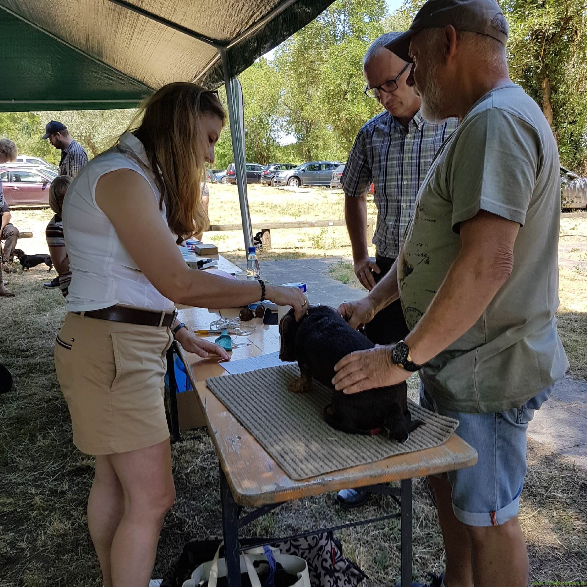 24 Teckel stellten sich vor. Frau Odenweller-Klügl erklärte die einzelnen Hunde ausführlich am Mikrofon, so dass das anwesende Publikum ihre Bewertungen gut nachvollziehen konnte. Alle Sitzmöglichkeiten rund um den Ausstellungsring waren gut belegt. Nicht jeder wollte ausstellen, sondern es kamen viele Besucher, die einfach aus Interesse und auf einen Plausch vorbeischauten.